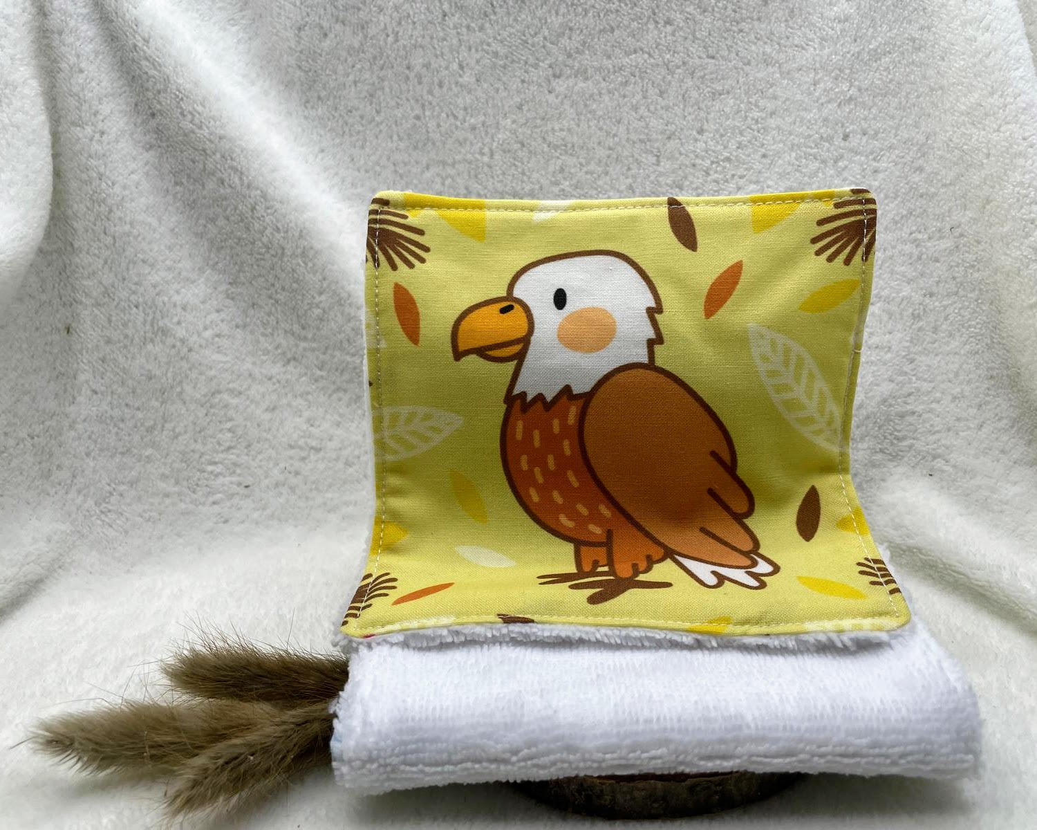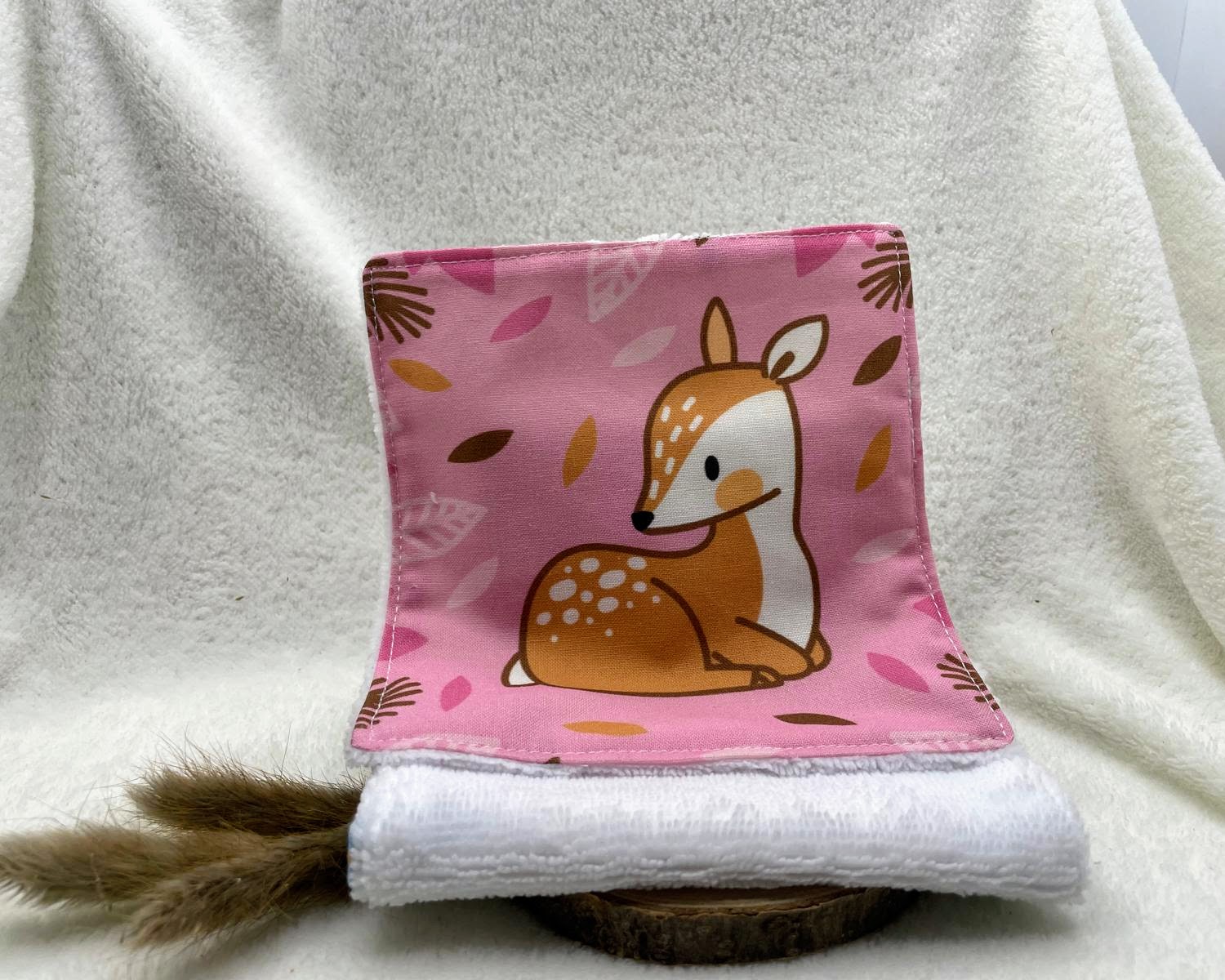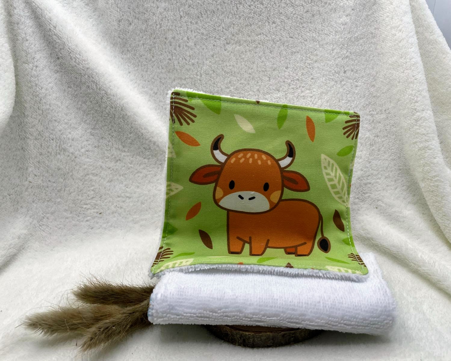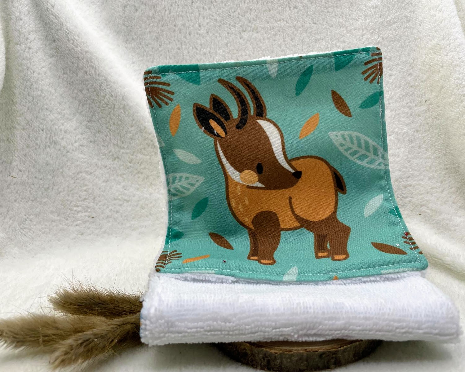 Chaque lingette est confectionnée à partir de tissu 100 % coton certifié Oeko-Tex, imprimé avec de jolis motifs animaux qui apportent une touche ludique et chaleureuse. La face lavante est réalisée en éponge certifiée Oeko-Tex, composée de 20 % coton, 40 % viscose de bambou et 40 % polyester. Cette combinaison offre un parfait équilibre entre douceur, absorption et résistance, idéale pour les peaux sensibles, y compris celles des tout-petits.
